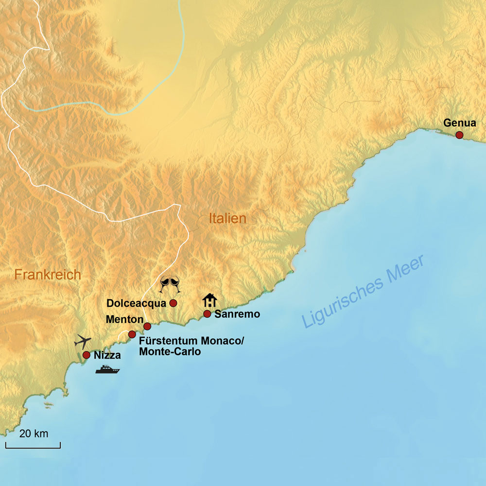 Wir besuchen die prachtvollen Städte Nizza, Genua und Monte-Carlo. Freuen Sie sich auch auf das kleine pittoreske Dolceacqua. Auf unserer Reise werden wir in den Genuss edler Weine und der beliebten Focaccia kommen. Bei unseren Erkundungen im Fürstentum Monaco sehen wir die neuromanische Kathedrale mit dem Grab von Grace Kelly sowie den Fürstenpalast und den Jachthafen.