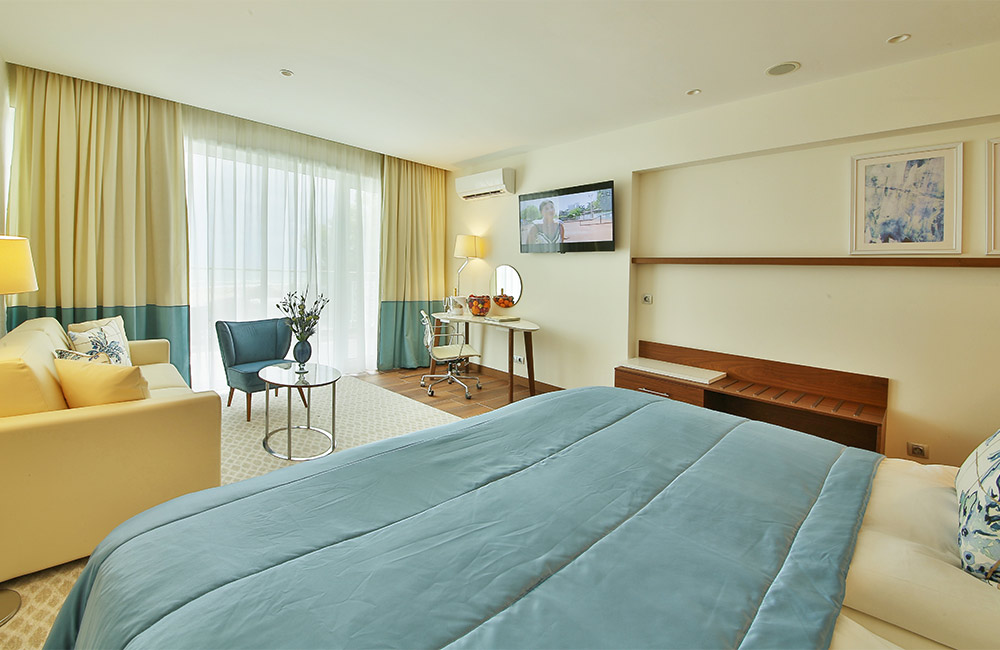 Klimaanlage, TV, Sitzgelegenheit, zusätzliche Schlafcouch, Kaffee- und Teezubereiter, Bügelmöglichkeit, Safe, Bad mit Dusche, Badewanne, Föhn, Bademantel