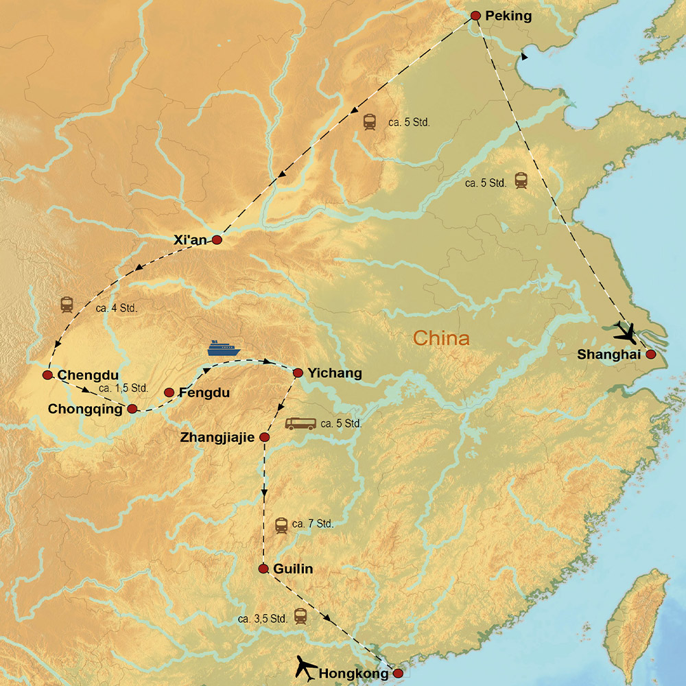 Von der glitzernden Skyline Shanghais bis zur Verbotenen Stadt in Peking, von der mächtigen Terrakotta-Armee bis zur entspannten Jangtse-Kreuzfahrt erleben Sie den außergewöhnlichen Facettenreichtum des Landes.