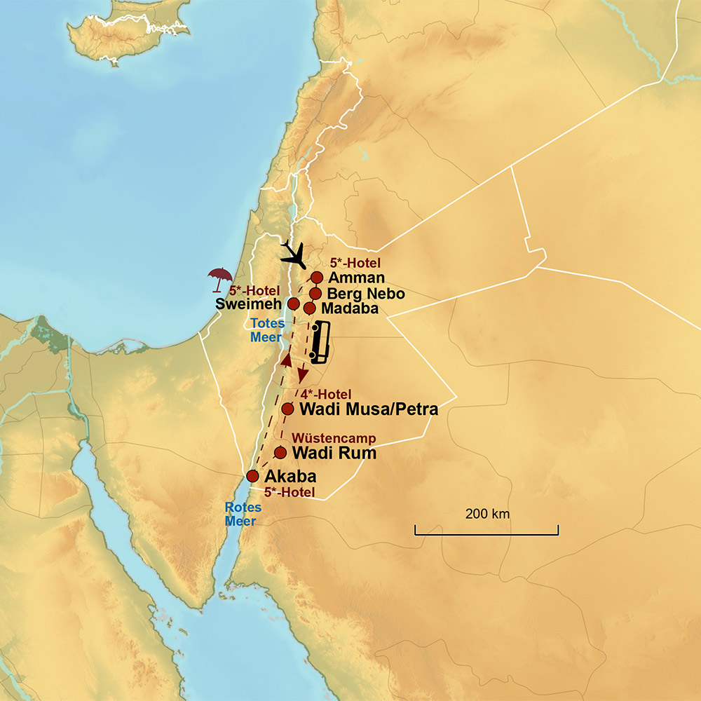Unsere Route ist mit viel Liebe zum Detail zusammengestellt, dabei stehen Sie als unser Gast jederzeit im Mittelpunkt. Wir fliegen mit Royal Jordanian und übernachten in sorgfältig ausgewählten Unterkünften, darunter komfortable 5-Sterne-Mövenpick-Resorts. Vor Ort werden wir von unserer deutschsprachigen Reiseleitung begleitet, die für eine durchgehend angenehme Atmosphäre sorgt.